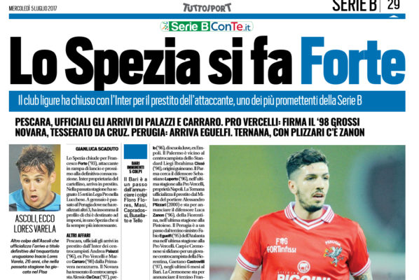 "Lo Spezia chiude per Francesco Forte (‘93), attaccante in rampa di lancio e prossimo alla definitiva consacrazione. Inter proprietaria del...