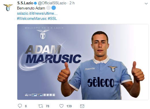 La Lazio annuncia tramite il proprio profilo Twitter di aver acquistato dall'Ostenda il centrocampista Adam Marusic. Di seguito il Tweet...