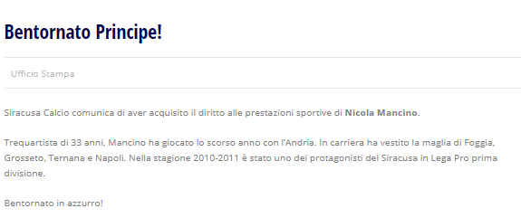 "Siracusa Calcio comunica di aver acquisito il diritto alle prestazioni sportive di Nicola Mancino. Trequartista di 33 anni, Mancino ha giocato...