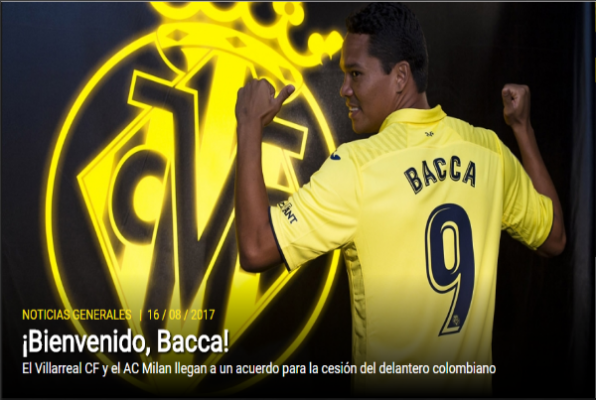 Attraverso una nota sul proprio sito ufficiale, il Villarreal annuncia l'arrivo di Carlos Bacca dal Milan. Ecco il comunicato: "Villarreal...