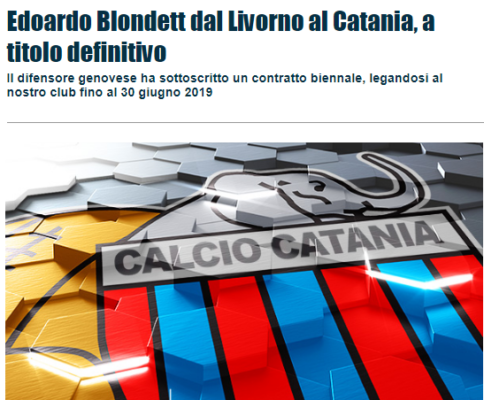 "Il Calcio Catania comunica di aver acquisito a titolo definitivo dall'A.S. Livorno Calcio il diritto alle prestazioni sportive del calciatore...