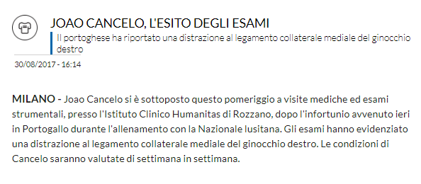 Con una nota pubblicata sul proprio sito ufficiale, l'Inter comunica le condizioni del terzino Joao Cancelo vittima di un infortunio...