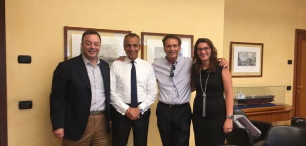 Cellino è alla testa di un gruppetto di 4 persone. Alle sue spalle l'ad. Sagramola, il ds Castagnini e il...