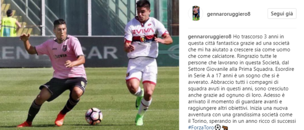 Il giovane Gennaro Ruggiero, attraverso il proprio profilo Instagram, dà un arrivederci al Palermo per il suo trasferimento al Torino,...