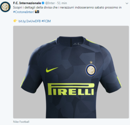 L'Inter tramite il proprio profilo Twitter ha svelato la terza maglia per la stagione 2017/2018. Di seguito il tweet del...