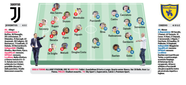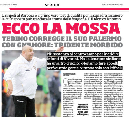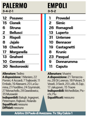 L'edizione odierna de "Il Corriere dello Sport" stila le probabili formazioni di Palermo-Empoli: "Palermo Allenatore: Tedino. A disp.: 1 Maniero, 22...