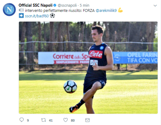 Il calciatore del Napoli Arkadius Milik si è sottoposto all'intervenuto chirurgico al ginocchio destro. L'intervento è perfettamente riuscito, come conferma...