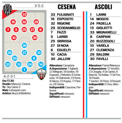 "QUI CESENA Perticone ancora fuori dall'elenco dei convocati, ma si rivede Donkor. Assente anche Cascione, in difesa spazio a Esposito....