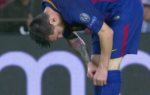 L'attaccante del Barcellona Leo Messi durante la sfida di ieri sera contro l'Olympiacos dopo pochi minuti estrae qualcosa dal calzettone...