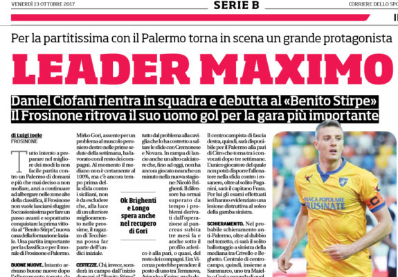 Corriere dello Sport: “Leader Maximo: Daniel Ciofani rientra in squadra e debutta al «Benito Stirpe». Il Frosinone ritrova il suo uomo gol per la gara più importante”