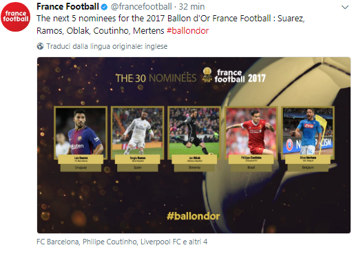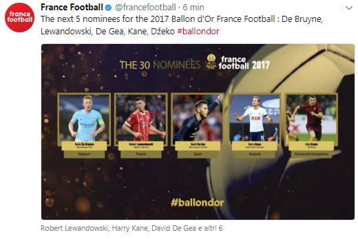 France Footbal da questa mattina sta annunciando i trenta finalisti per la vittoria finale del Pallone D'oro 2017. Nella lista...