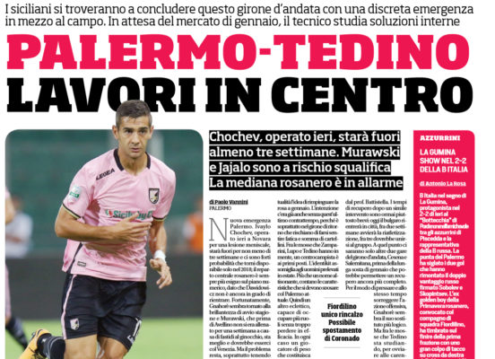 "Nuova emergenza Palermo. Ivaylo Chochev, operato ieri a Novara per una lesione meniscale, starà fuori per non meno di tre...