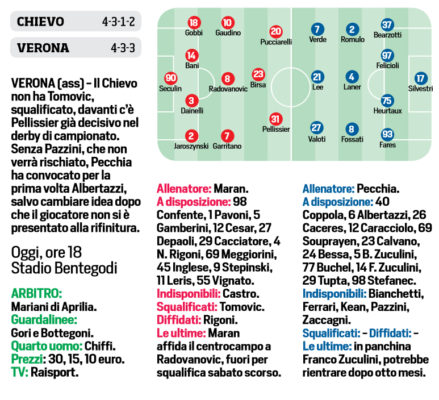 L'edizione odierna de "Il Corriere dello Sport" ha stilato le probabili formazioni del derby di Verona in programma oggi valevole...