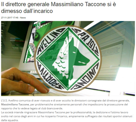 "L’U.S. Avellino comunica di aver ricevuto e di aver accolto le dimissioni consegnate dal direttore generale, Massimiliano Taccone, per problematiche strettamente...