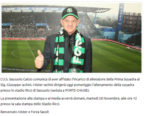 "L’U.S. Sassuolo Calcio comunica di aver affidato l’incarico di allenatore della Prima Squadra al Sig. Giuseppe Iachini. Mister Iachini dirigerà...