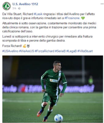 Il calciatore dell'Avellino Richard Lasik, vittima di un brutto infortunio nella gara di ieri contro il Frosinone si trova a...