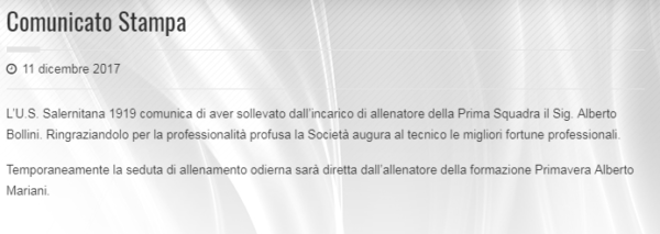 "L’U.S. Salernitana 1919 comunica di aver sollevato dall’incarico di allenatore della Prima Squadra il Sig. Alberto Bollini. Ringraziandolo per la...