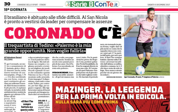 "Igor Coronado, un metro e sessantanove di fantasia, gioia e divertimento anche nella nuova versione di centrocampista. «Prego, 1.70 ...»....