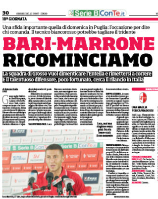 Corriere dello Sport: “Bari-Marrone ricominciamo. La squadra di Grosso vuol dimenticare l’Entella e rimettersi a correre”