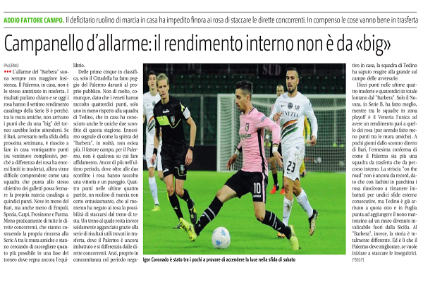 "L'allarme del "Barbera" suona sempre con maggiore insistenza. Il Palermo, in casa, non è lo stesso ammirato in trasferta. I...