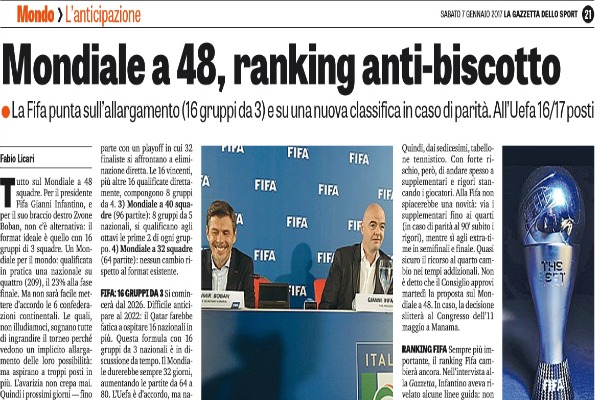 "Tutto sul Mondiale a 48 squadre. Per il presidente Fifa Gianni Infantino, e per il suo braccio destro Zvone Boban,...