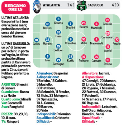 L'edizione odierna de "Il Corriere dello Sport" ha stilato le probabili formazioni del match di Tim Cup, Atalanta-Sassuolo. Ecco le...