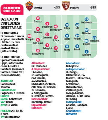 L'edizione odierna de "Il Corriere dello Sport" ha stilato le probabili formazioni del match di Tim Cup, Roma-Torino. Ecco le...