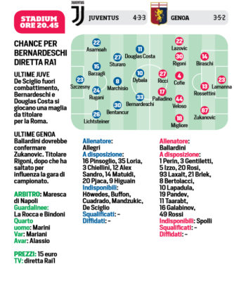 L'edizione odierna de "Il Corriere dello Sport" ha stilato le probabili formazioni del match di Tim Cup, Juventus-Genoa. Ecco le...
