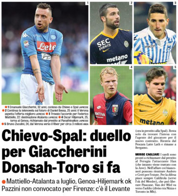 Gazzetta dello Sport: “Mattiello-Atalanta a luglio, Genoa-Hiljemark ok. Pazzini non convocato per Firenze: c’è il Levante. Tutte le trattative del giorno in serie A”