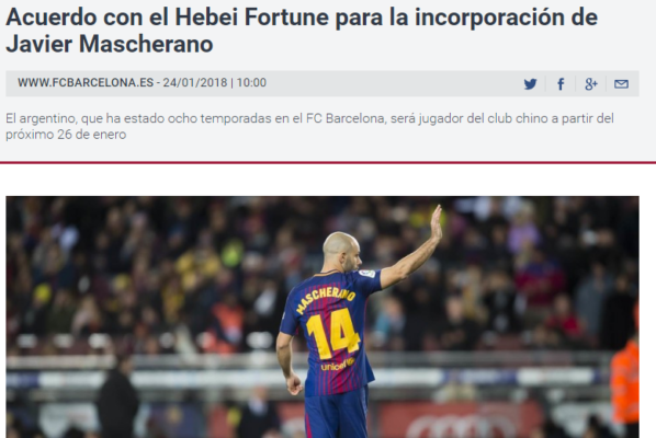 Il Barcellona comunica, tramite il proprio sito ufficiale, di aver trovato l'accordo per il trasferimento di Javier Mascherano all'Hebei China...