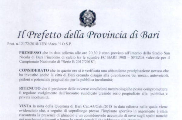 L'indiscrezione era già di qualche ora fa, ma adesso è arrivata anche l'ufficialità. A causa del mal tempo anche Bari-Spezia...