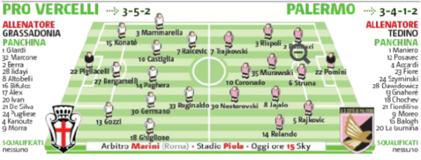 In alto le probabili formazioni, proposte dall'edizione odierna del "Giornale di Sicilia", del match di serie B Pro Vercelli-Palermo, in...
