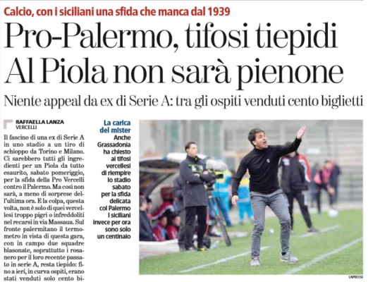 L'edizione odierna de "La Stampa" scrive come i tifosi della Pro Vercelli si stanno preparando al match contro il Palermo....