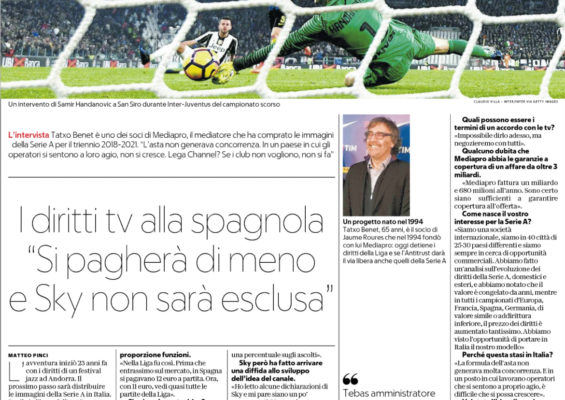"Tatxo Benet è uno dei soci di Mediapro, il mediatore che ha comprato le immagini della Serie A per il...