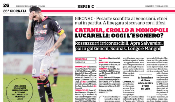 L'edizione odierna de "Il Corriere dello Sport" ha analizzato il crollo del Catania contro il Monopoli: "Cinque schiaffi per Lucarelli...