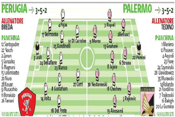 L'edizione odierna de "Il Corriere dello Sport" ha stilato le probabili formazioni di Perugia e Palermo, gara in programma oggi...