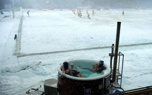 Danimarca: freddo e neve durante un match, tre ragazze in bikini a bordocampo….