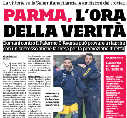 Corriere dello Sport: “Parma, l’ora della verità. Domani contro il Palermo D’Aversa può provare a riaprire con un successo anche la corsa per la promozione diretta”