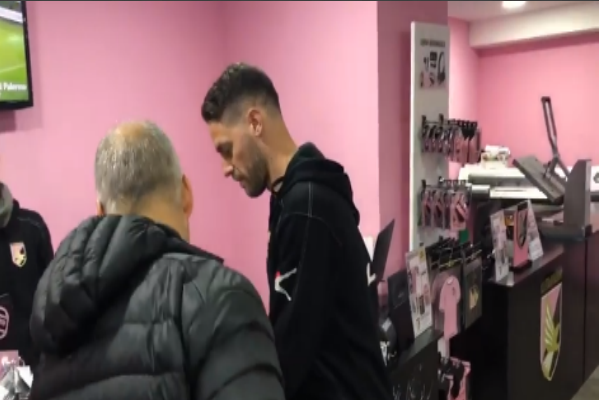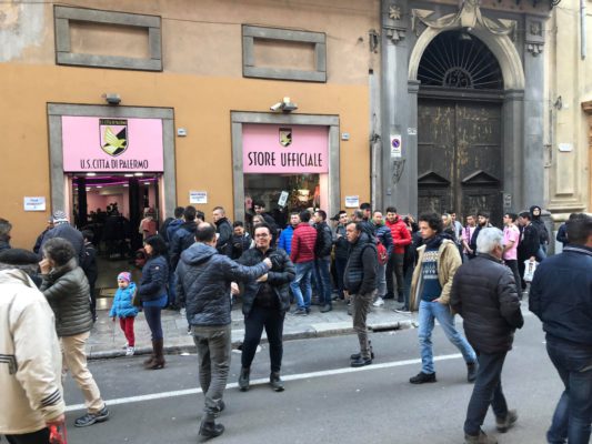 I tifosi del Palermo sono in attesa all'esterno dello store ufficiale rosanero di via Maqueda per incontrare il terzino Andrea...