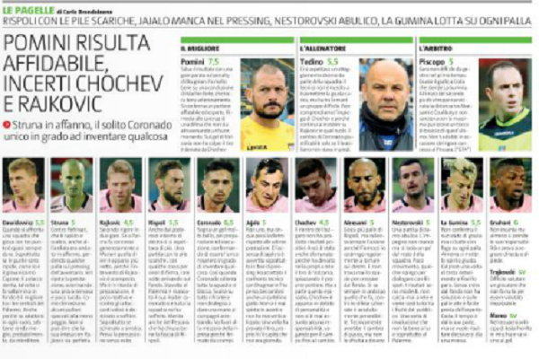Giornale di Sicilia: “Pomini affidabile, incerti Rajkovic e Chochev – le pagelle di Palermo-Pescara”