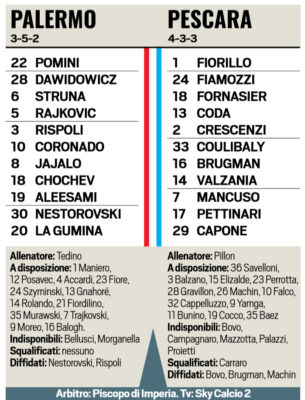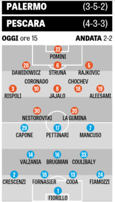 In alto, le probabili formazioni del match di oggi tra Palermo e Pescara, in programma alle 15, proposte nell'edizione odierna...