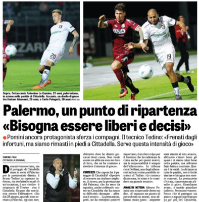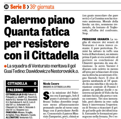 In alto le pagelle del Palermo, secondo la "Gazzetta dello Sport", per il match giocato ieri sera conto il Cittadella....