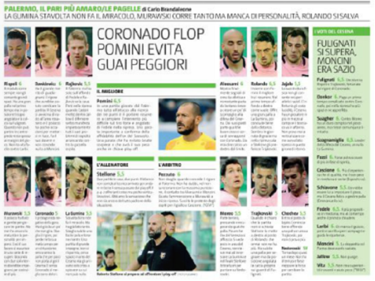 L'edizione odierna di Tuttosport ha stilato le pagelle di Palermo-Cesena. Ecco le valutazioni: Palermo (4-4-2): Pomini 6.5; Rispoli 5.5, Dawidowicz...