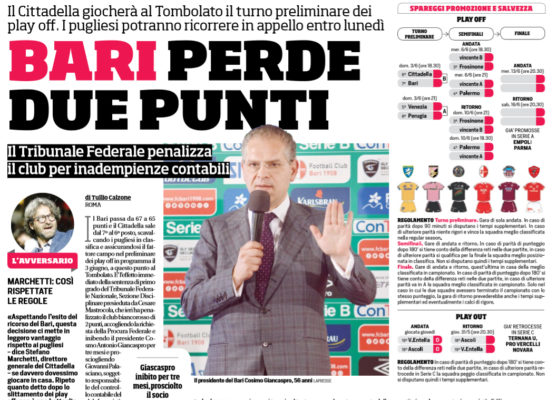 "Il Bari passa da 67 a 65 punti e il Cittadella sale dal 7º al 6º posto, scavalcando i pugliesi...