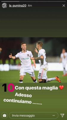 Attraverso le proprie storie instagram, Nino La Gumina celebra il suo decimo gol con la maglia rosanero. Ecco in alto...