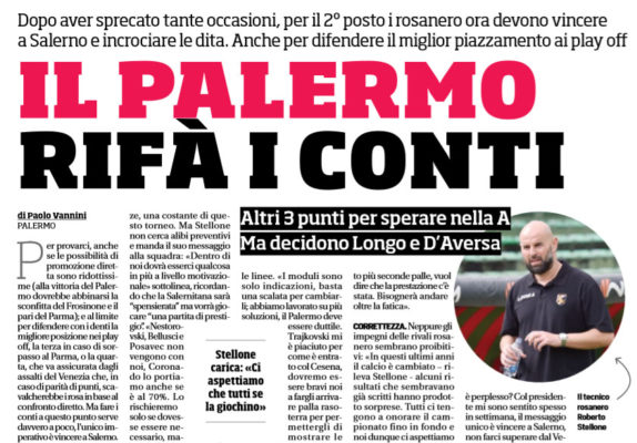"Per provarci, anche se le possibilità di promozione diretta sono ridottissime (alla vittoria del Palermo dovrebbe abbinarsi la sconfi tta...