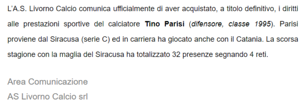 "L’A.S. Livorno Calcio comunica ufficialmente di aver acquistato, a titolo definitivo, i diritti alle prestazioni sportive del calciatore Tino Parisi (difensore, classe...