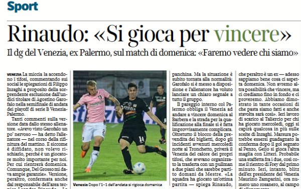 L'edizione odierna del "Corriere del Veneto" riporta le parole del dg del Venezia Leandro Rinaudo nonché ex difensore del Palermo....