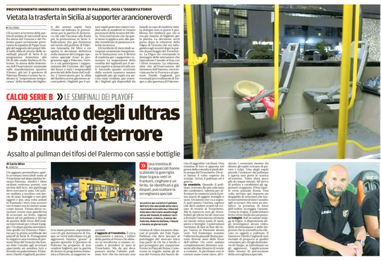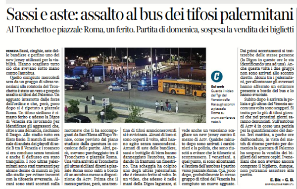L'edizione odierna del "Corriere del Veneto" scrive degli scontro tra gli ultras veneziani e quelli palermitani avvenuti dopo la gara...