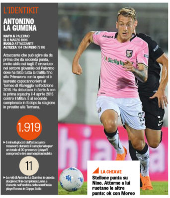 L'edizione odierna de "La Gazzetta dello Sport" scrive un'ampia analisi sull'attaccante del Palermo Nino La Gumina, autore del momentaneo vantaggio...